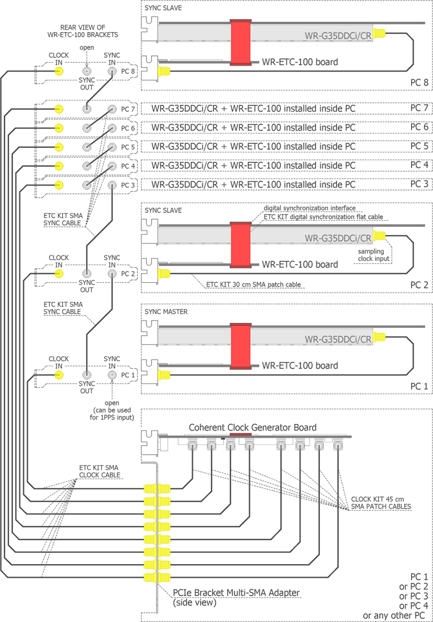 The ETC Kit consists of a single ETC board (a PCIe card), two long SMA coaxial cables, one flat cable and other kit accessories. One coaxial cable is for distribution of the 100 MHz coherent sampling clock. The second coaxial cable is for digital synchronization of the receivers. The flat cable connects the WR-G35DDCi/CR receiver with the ETC board. Each WR-G35DDCi receiver has to be equipped with the ETC kit, therefore the number of ETC kits required is equal to the number of WR-G35DDCi receivers in the coherent multichannel group.